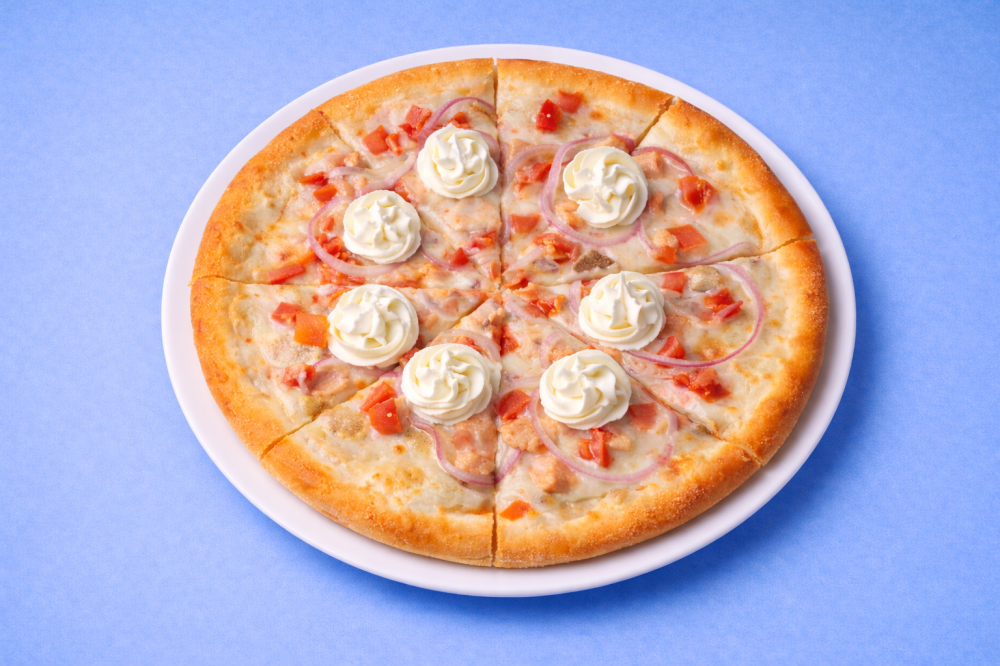 Cливочная основа, фирменное тесто, моцарелла, лосось, творожный сыр,лук шалот