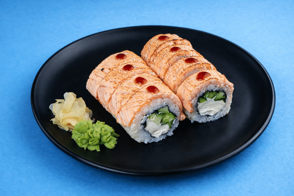 Этот ролл — воплощение мягкости и баланса: нежный сливочный сыр сочетается с сочным лососем и отборным рисом, а тонкая обработка придаёт ему тёплый, слегка подкопчённый акцент. Каждая порция — это гармония вкуса и текстуры, созданная для истинных ценителей.